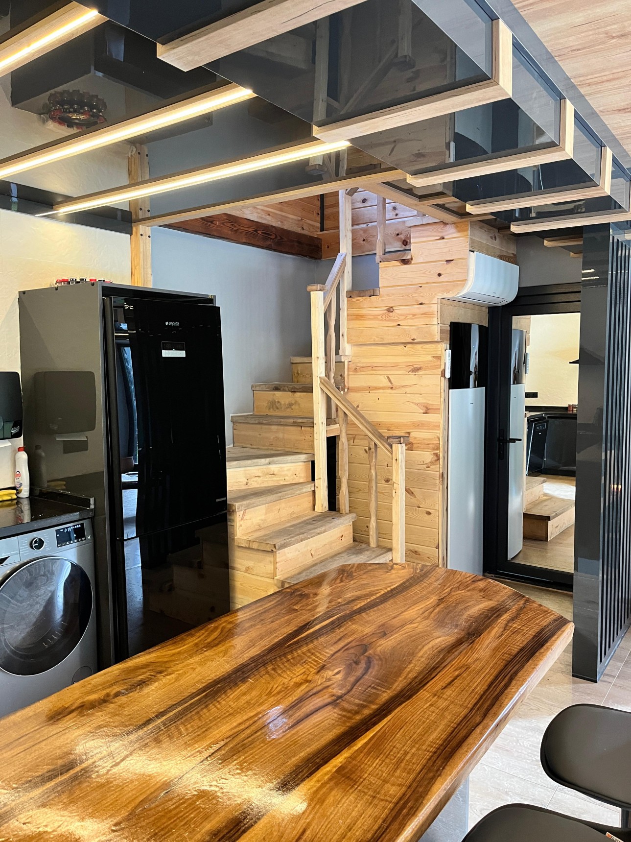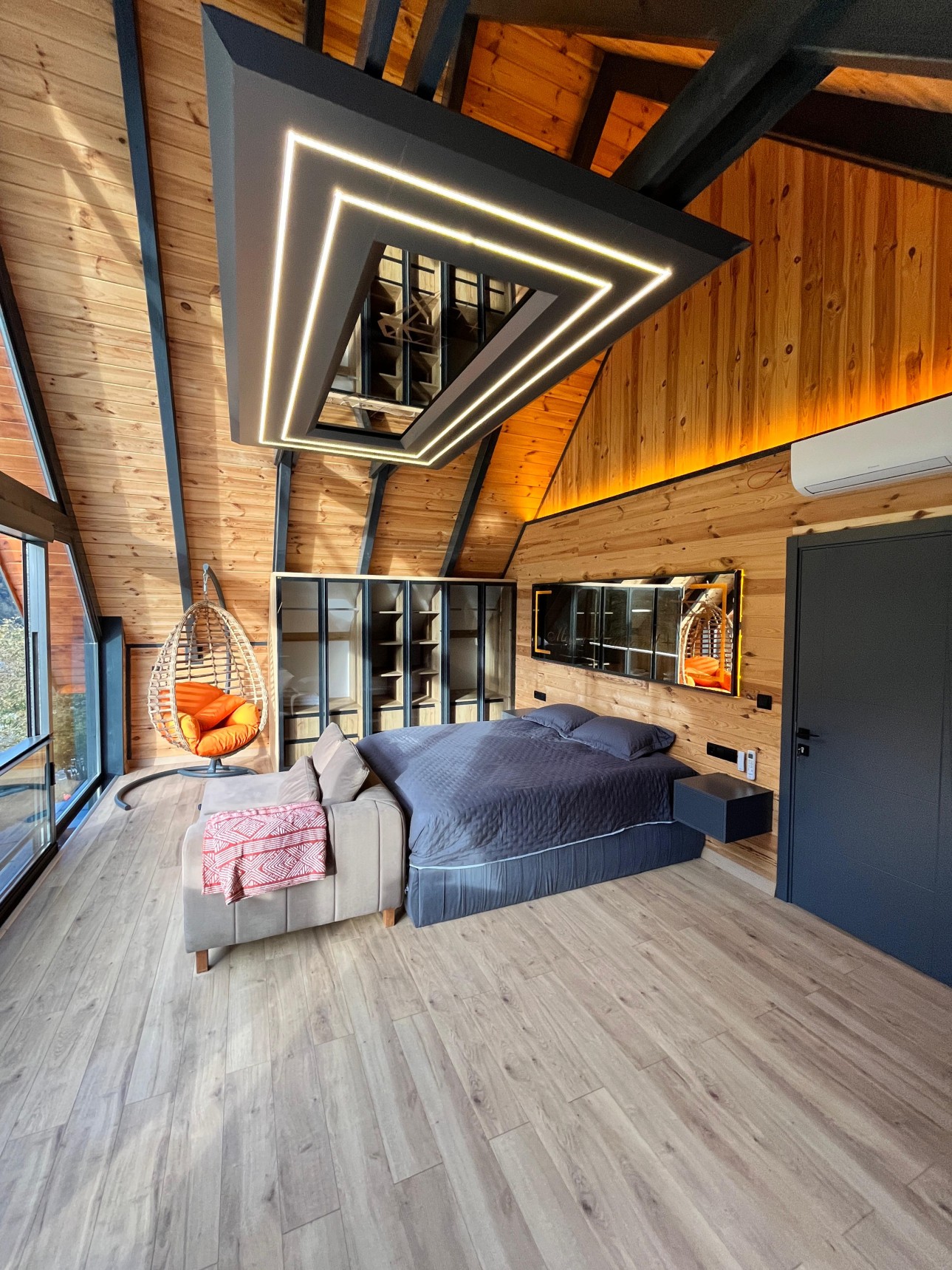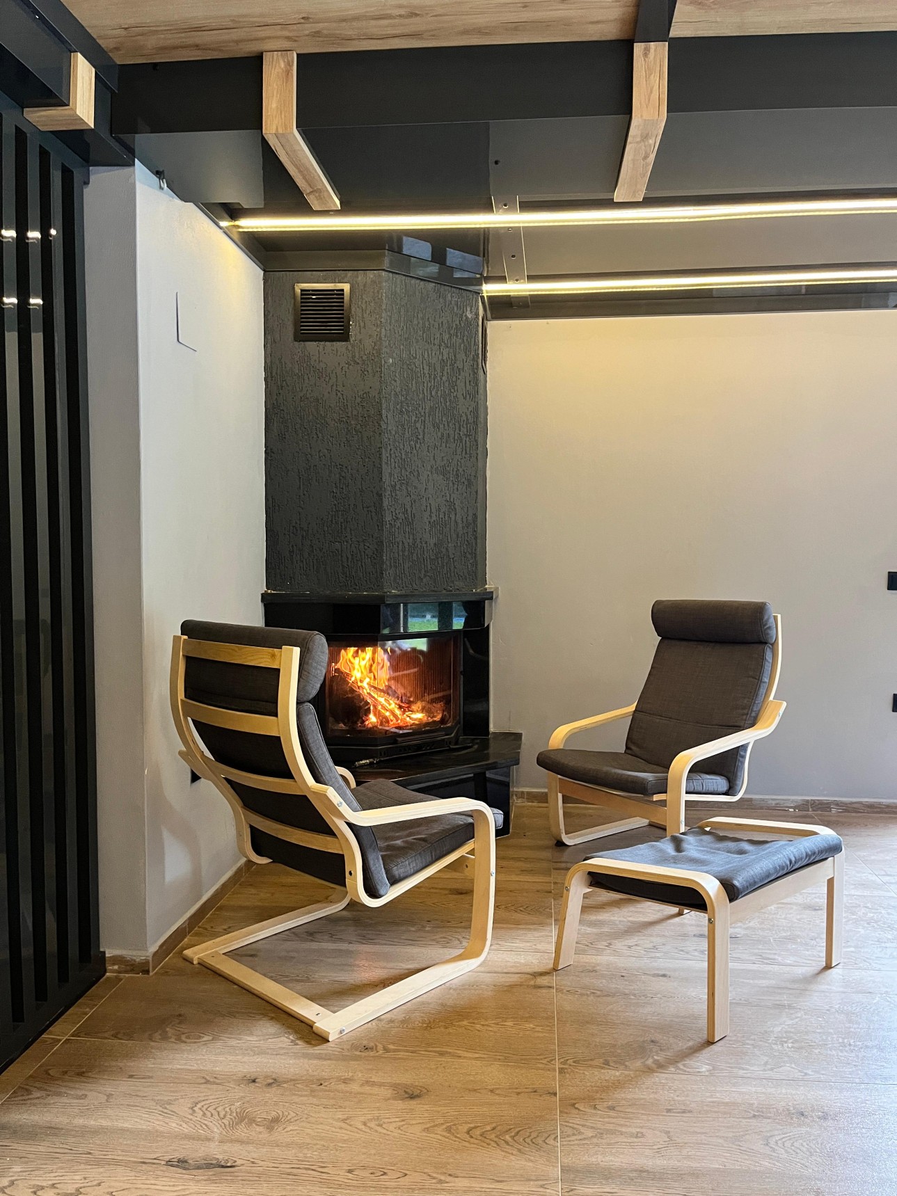 Şömine etrafında keyifli sohbetler etmek için geniş oturma alanı ve yerden ısıtma sistemiyle sıcacık bir tatil deneyimi sunar.